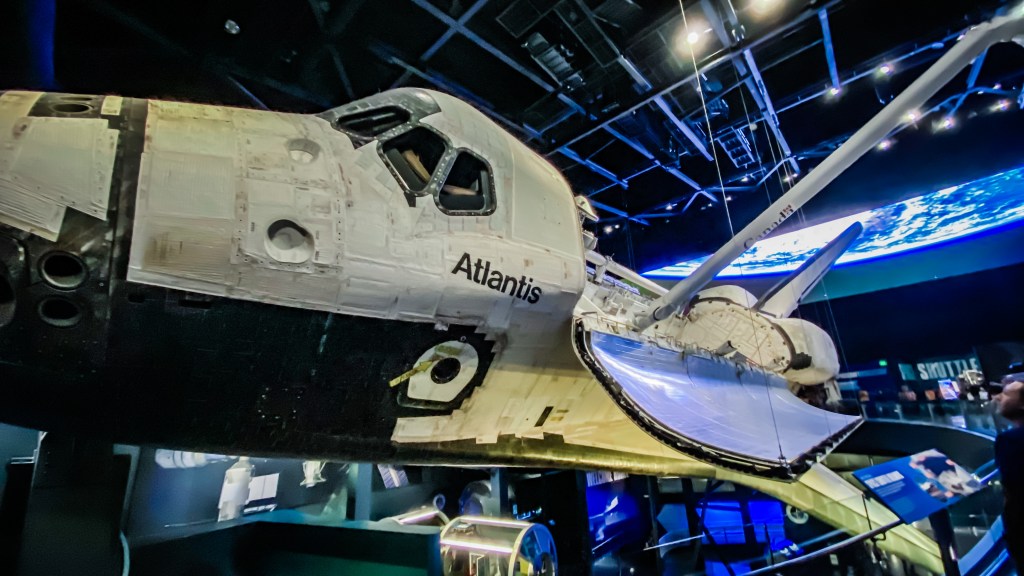 Nous continuons la visite avec le building « Atlantis ». Il retrace toute l’histoire de la navette spatiale, celle ayant transporté nos talentueux aventuriers français : Jean-Loup Chrétien et Patrick Baudry. Au programme : film historique sur écran grand format. En fin de projection, l’écran devient translucide, et la navette Atlantis (la vraie !) apparaît, sur fond de musique de super-production. L’écran s’ouvre et nous accédons aux abords de cette impressionnante machine volante. Waw. Ça fait son effet. Nous en avons les poils hérissés. Le show est impeccable.