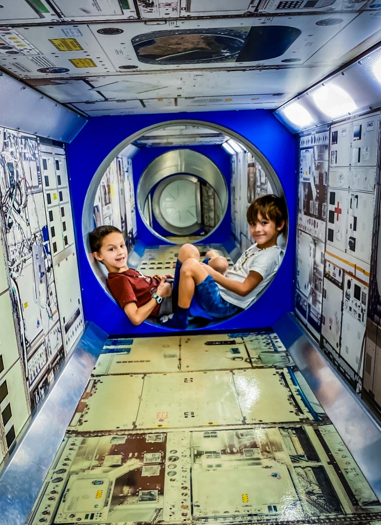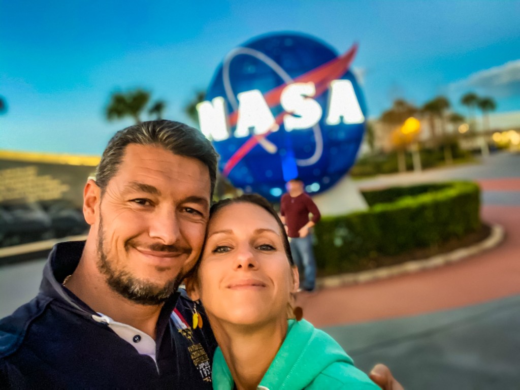 Le hangar accueillant la navette propose plusieurs simulateurs. Certains permettent de manœuvrer le bras articulé de la navette, certains proposent de tester une sortie extra véhiculaire, d’autres permettent de poser la navette. Ayant tout testé, avec plus ou moins de réussite, mais avec un réel engouement, nous accédons au simulateur de décollage en fusée. Affaires déposées et poches vidées, nous nous installons. Le simulateur s’incline en arrière avant le compte à rebours. Nous sentons la gravité s’exercer, le dos ancré dans le siège, puis les moteurs s’allument. Tout vibre avec vigueur. Nous « arrivons » en orbite et le simulateur s’ouvre, comme la navette ouvrirait son sas supérieur, pour nous permettre d’admirer la Terre, l’espace de quelques secondes. Nous voilà en train de survoler la Corse. Juste la Corse. Puis les portes se referment. Stupéfiant. L’île de beauté mise en lumière ici, en Floride. Celle qui nous a rassemblé Valou et moi, nous ayant au fil du temps permis d’en arriver là …