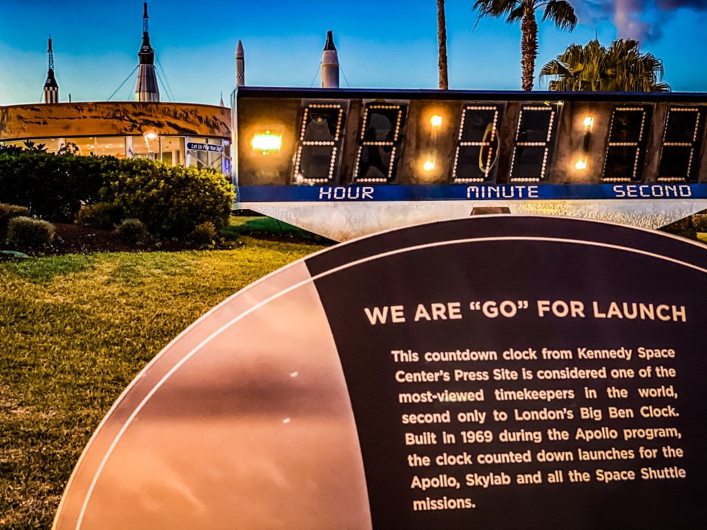 Nous regagnons la sortie au crépuscule. Nous nous arrêtons une dernière fois devant le sigle de la NASA, et devant le chronomètre conçu en 1969 pendant le programme « Apollo », afin de prendre quelques (dernières) photos souvenir.