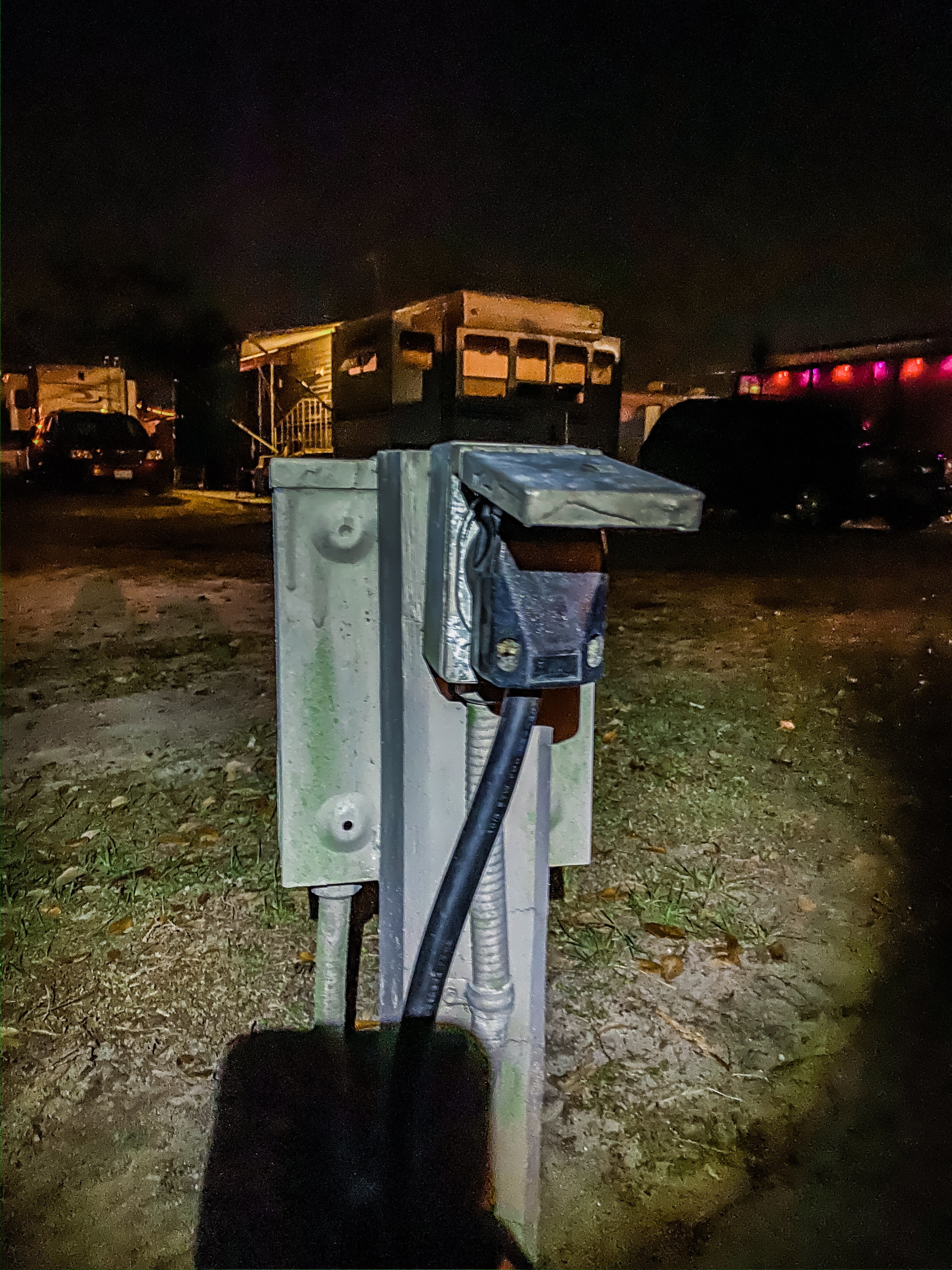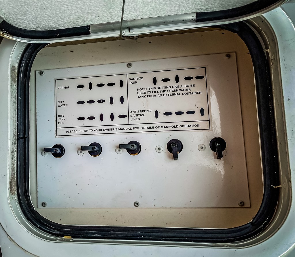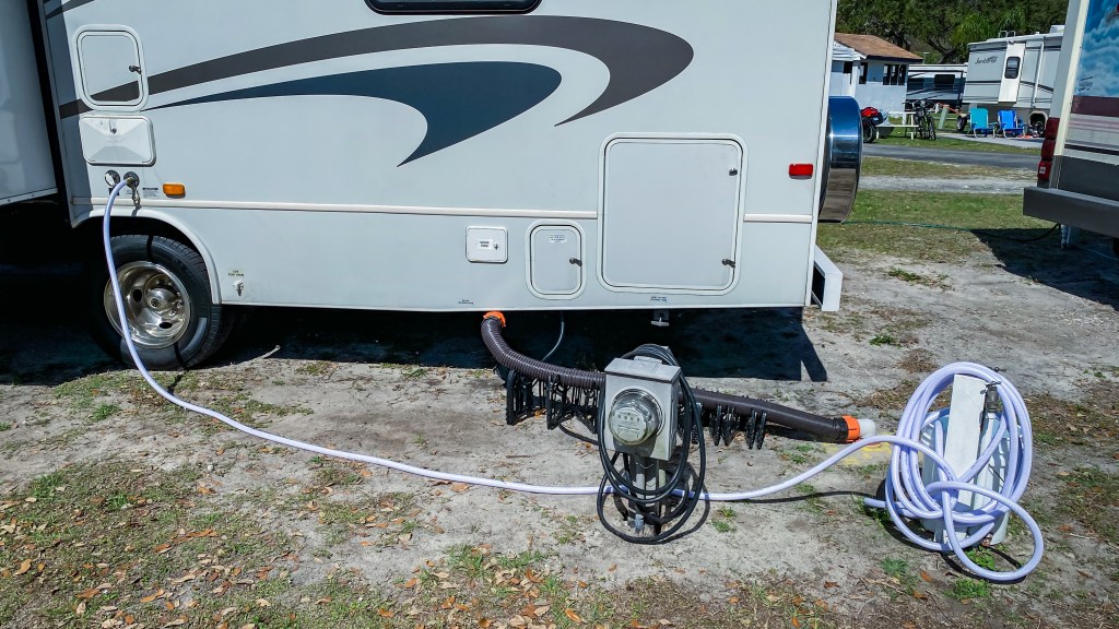 Nous trouvons notre emplacement et débutons les manoeuvres, sans problème particulier. Nous mettons le RV à niveau grâce aux cales et je me rends à l’arrière gauche, afin de connecter les organes. Je branche l’eau. Je branche l’électricité. Je retire le bouchon de vidange des eaux usées en ayant bien vérifié que les vannes étaient fermées et je me prends un bon litre sur les tongs. Grrrrr. Je débranche l’eau. Je me nettoie. Je re branche l’eau et connecte le tuyau de vidange des eaux usées. Bon. Première expérience peu convaincante. Ce n’est pas normal que du liquide soit sorti comme ça. On verra bien à la prochaine connexion.