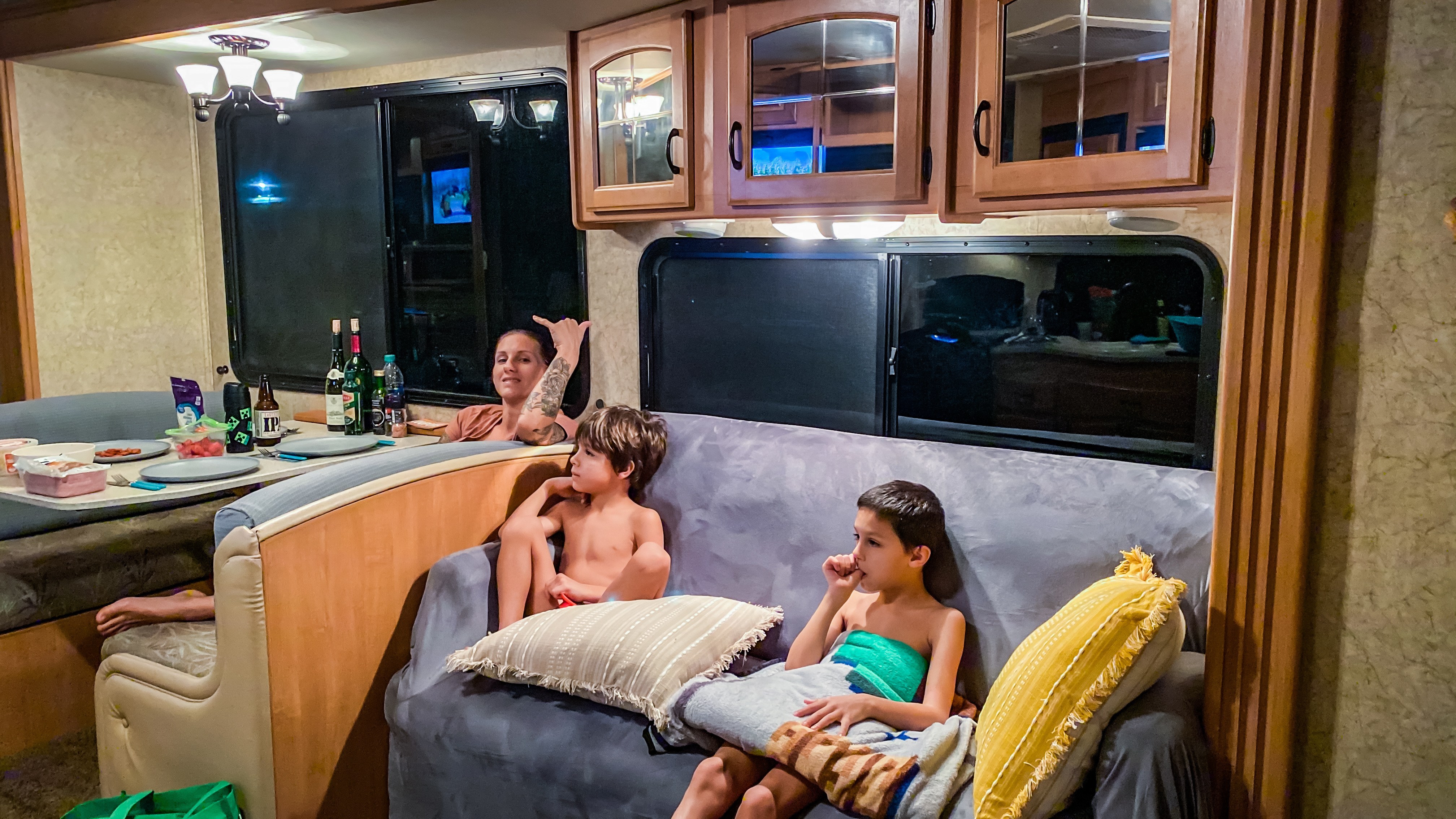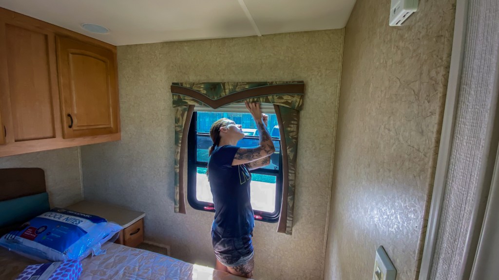 Nous nous arrêtons au Walmart pour acheter de quoi nettoyer et équiper le RV. Il a été très bien entretenu, mais Wayne avait un gros toutou, qui devait adorer se baigner. Il règne donc une odeur de chien mouillé, incrustée dans la moquette et sur le canapé. Nous commençons, vers 20h30, à remplir un caddie avec une shampouineuse, et nous sortirons vers 1h du matin avec deux caddies pleins. De la vaisselle aux housses de matelas, du nécessaire de bricolage aux tringles de rideaux, tout y passe.