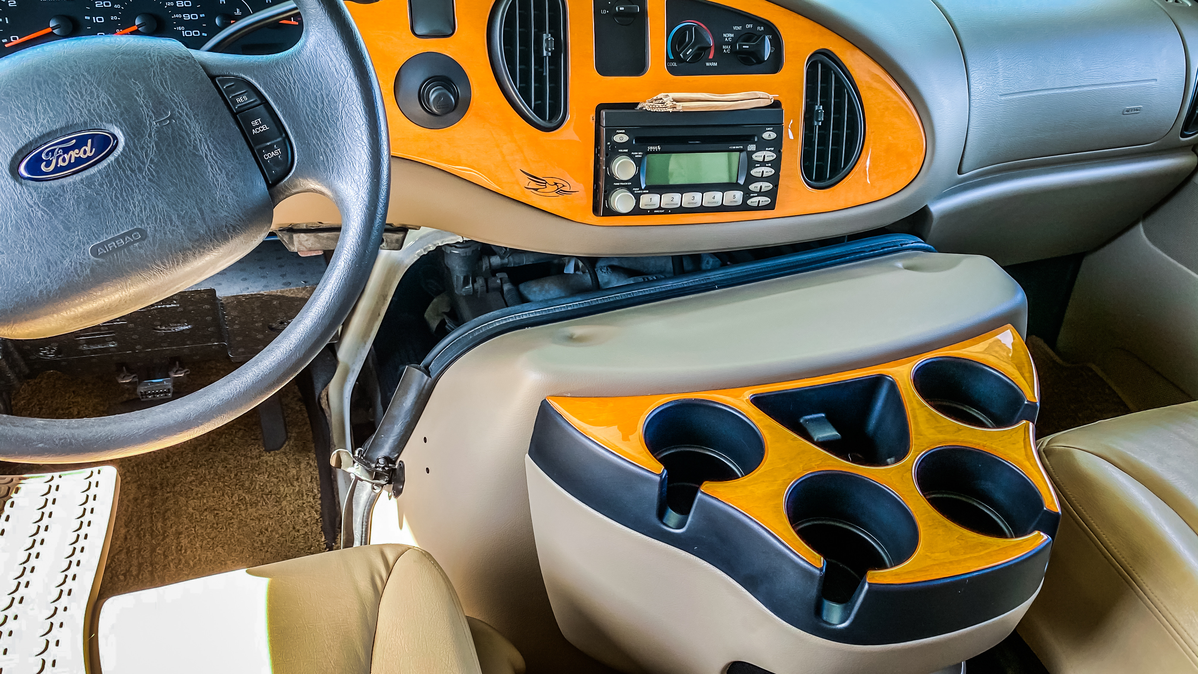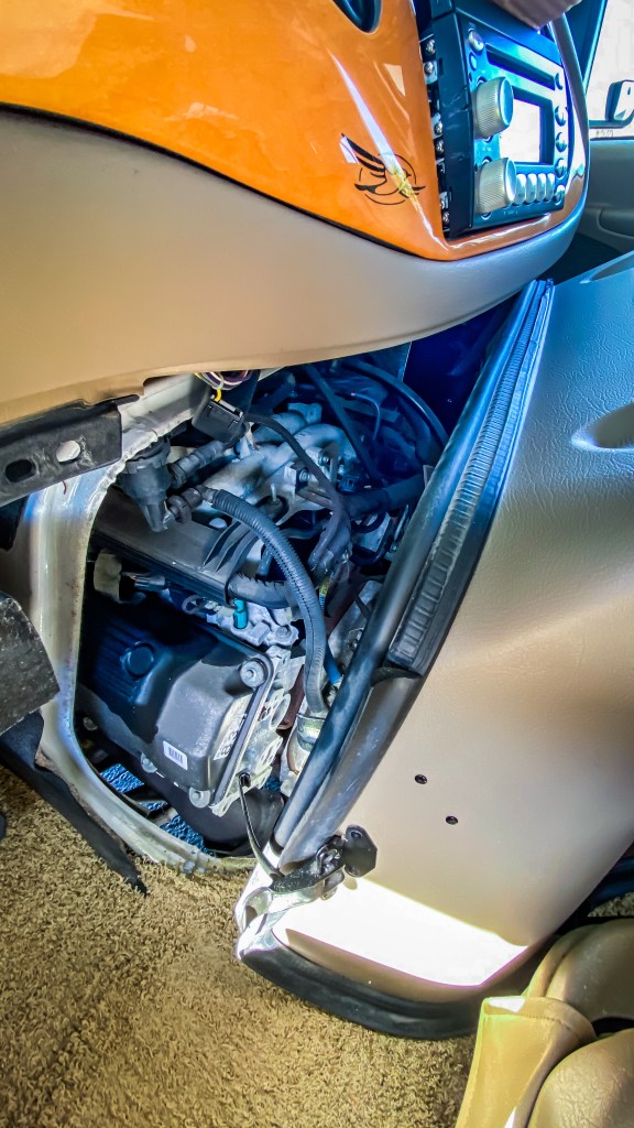 Mardi matin, Valou démonte tous les encadrements de fenêtres, qui ne nous plaisent pas. De plus, un des stores ne fonctionne plus et reste en position basse. Elle enchaîne en débutant le plus gros du ménage. Quant à moi, je commence à nettoyer la partie poste de pilotage. Le gros bloc central est pourvu de quatre attaches que je retire avec précaution, et je tire sur le bloc. Quelle surprise que de découvrir une bonne partie du moteur, juste là, sous le poste radio, avec vue directe sur le bitume ! L’isolation phonique est pourtant bonne lorsque nous sommes sur la route. En tous cas, ça me permet d’accéder aux branchements du poste radio. J’en profite pour connecter deux câbles qui me permettront de relier le téléphone (et donc toutes nos playlists de musique). Le manque de prise USB ou auxiliaire sur le poste était une de mes déceptions lors de l’achat du véhicule, et voilà le problème réglé ! Bien content de savoir que l’on pourra avaler les miles avec nos musiques préférées.