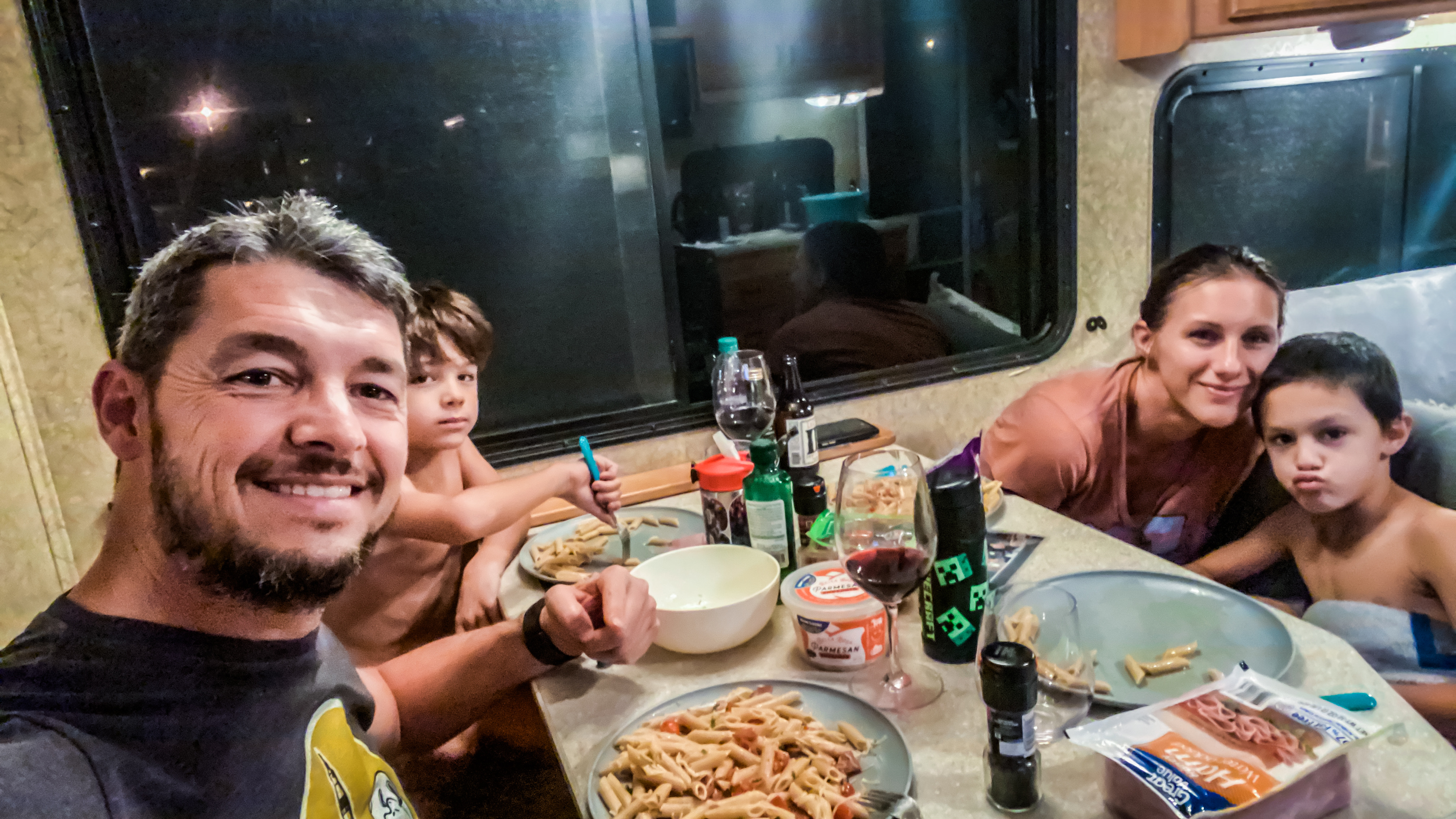 Nous allons acheter nos vannes de remplacement et de quoi faire nos pique-niques pour Disney. Nous changerons les vannes lundi prochain, jour de break après les trois premiers jours de parc. Mais ce soir, le RV est rangé, nettoyé (même si ça sent toujours – il va falloir trouver une solution), l’électricité est là, la fraîcheur aussi, et nous dégustons un bon plat de pâtes au basilic frais, avec un verre de vin rouge d’Argentine. Un très bon moment de calme avant la cohue des prochains jours.