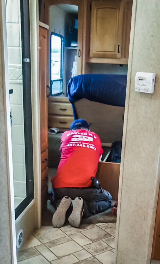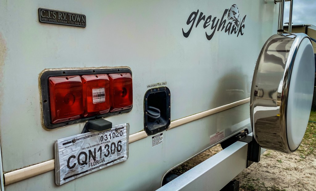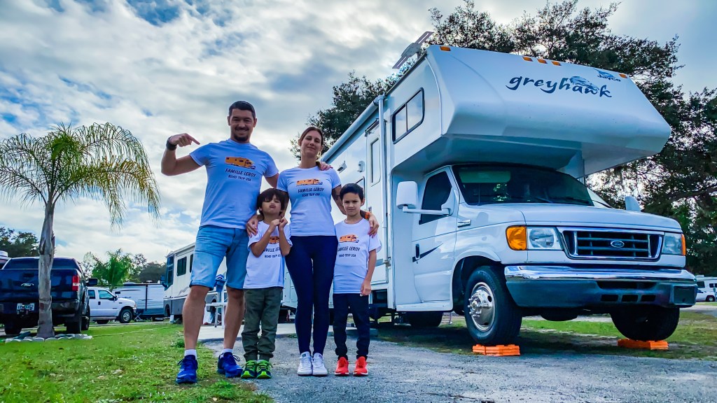 Mercredi matin, nous loupons le réveil, alors qu’il faut libérer la chambre pour 11 heures. Branle-bas de combat ! C’est évidemment le carnage, puisque nous n’avons rien rangé la veille au soir, par fatigue autant que par flemme. Malgré tout, nous transvasons notre « bordel » dans le RV avec efficacité, et nous prenons la route pour Melbourne. Nous rendons le véhicule de location, et nous partons enfin à quatre dans notre nouvelle maison. Ce sont nos premiers kilomètres, que dis-je, nos premiers miles ensemble dans le RV. Direction Kissimmee, au sud d’Orlando, dans notre premier RV Park (c’est le nom donné aux campings aux USA). Mais avant cela, nous nous arrêtons à Camping World, un magasin spécialisé dans les pièces pour RV. C’est un peu le Norauto du camping-car. J’ai besoin de remplacer le robinet de vidange du circuit d’eau. Je trouve la même pièce en quelques minutes. Parfait. Je débute le bricolage sur le parking. L’eau s’évacue rapidement et lorsque je mets en place le nouveau robinet, il n’est pas adapté. C’était pourtant le même, et il n’y a pas d’autre modèle. Bigre ! Je remets l’ancien et nous partons chercher un magasin de bricolage pour trouver du ruban d’étanchéité et un collier de serrage adapté. Je reprends le bricolage sur ce nouveau parking et répare le robinet. Rien de bien méchant, mais c’est une perte de temps conséquente. Si bien que nous arrivons à Kissimmee au crépuscule.