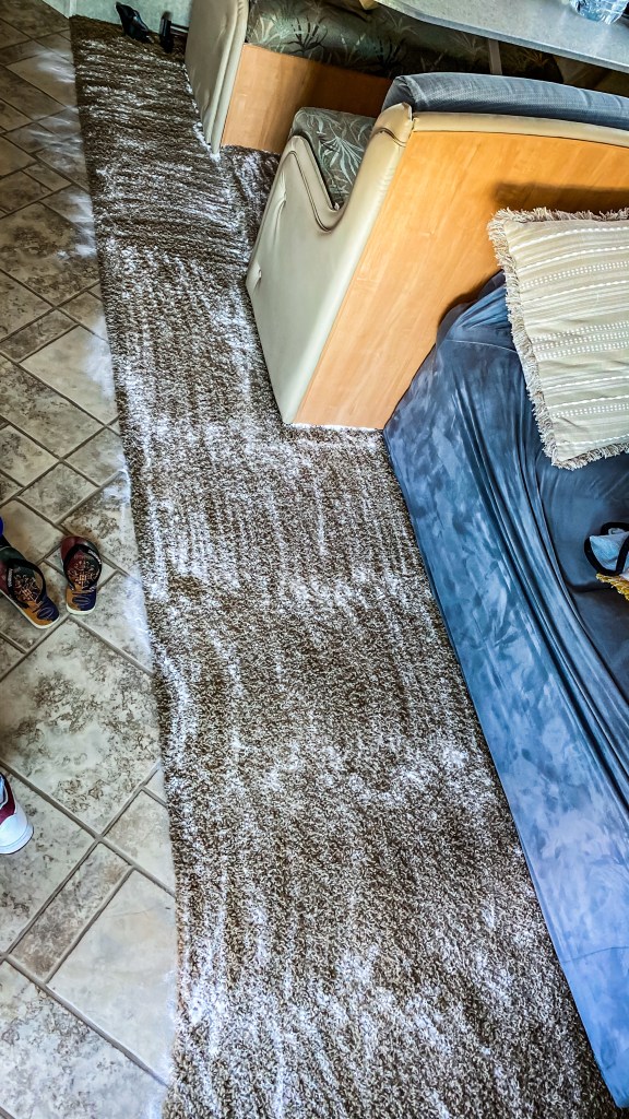 Allez, encore une belle journée de remise en oeuvre avant de repartir chez Mickey puis Universal Studio. Nous viendrons également à bout des odeurs en utilisant une poudre de bicarbonate de soude que nous laisserons agir toute une journée, pendant que nous serons dehors.