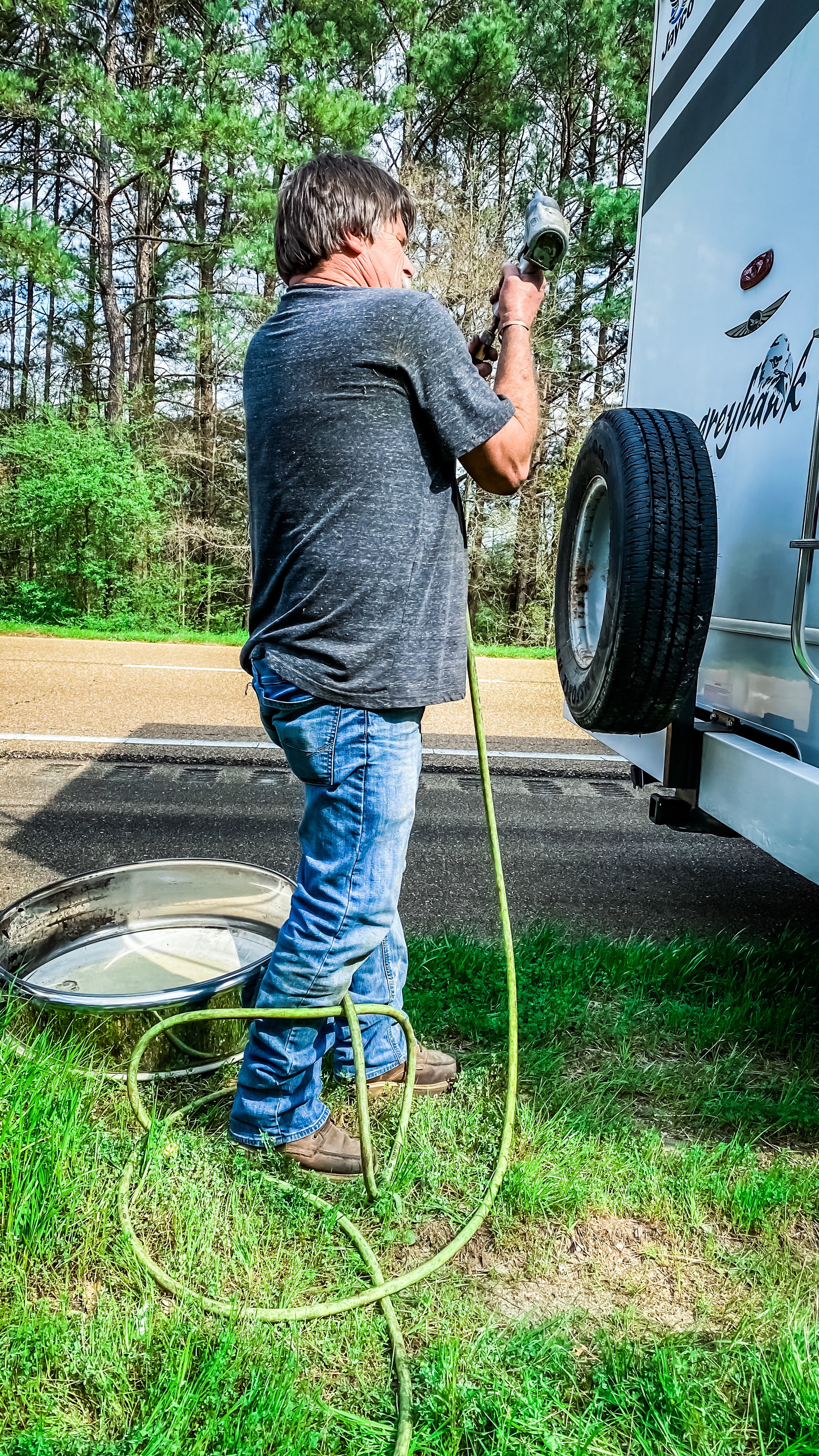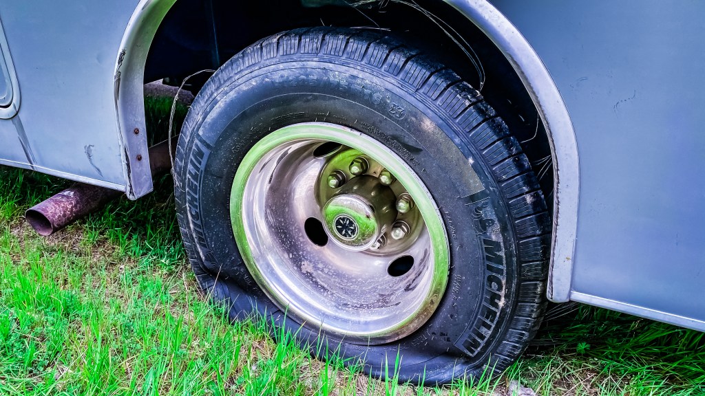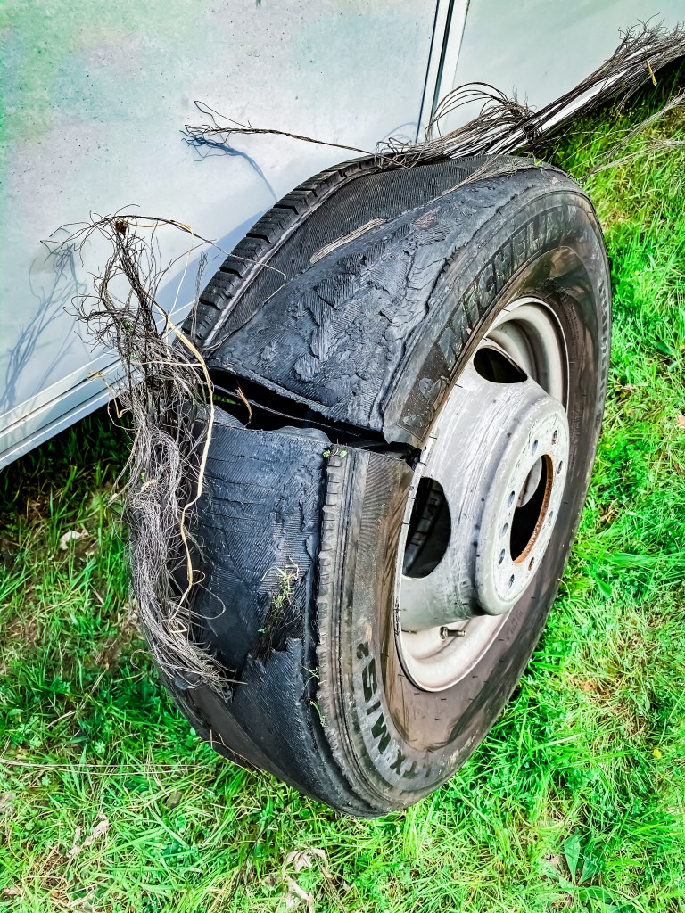 Quelques minutes plus tard, je commence à percevoir des vibrations dans le volant. Elles s’intensifient assez rapidement. Je lève le pied et tout à coup : « BOUM !!! ». Un énorme bruit provient de l’arrière du RV, comme si une partie avait explosé, et j’entends dans la foulée des morceaux frotter sur le bitume et accrocher le dessous du véhicule. Je jette un oeil aux rétros. Nous répandons une bonne quantité de débris sur la route. On a arraché quelque chose, mais quoi ? Je m’arrête sur le bas côté. Par chance, nous avons un peu de place, même si c’est un peu en pente. Je sors voir les dégâts. La roue arrière à droite a explosé. Une énorme partie de la bande de roulement s’est arrachée et a tapé sur la plaque métallique servant de garde-boue juste derrière. Cette dernière a explosé à son tour, et a tapé sur le pot d’échappement, ainsi que sur la canalisation de propane. Heureusement, il n’y a que des impacts et rien n’est troué. Pas de fuite de propane. Pas d’accident pour nous. Pas d’accident derrière. Nous nous mettons en sécurité et je vais déblayer la route car il y en a qui ont failli se frotter en voulant éviter le gros morceau de pneu sur la voie de droite.