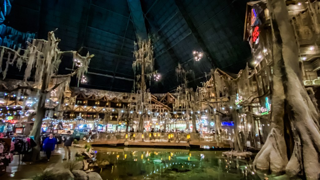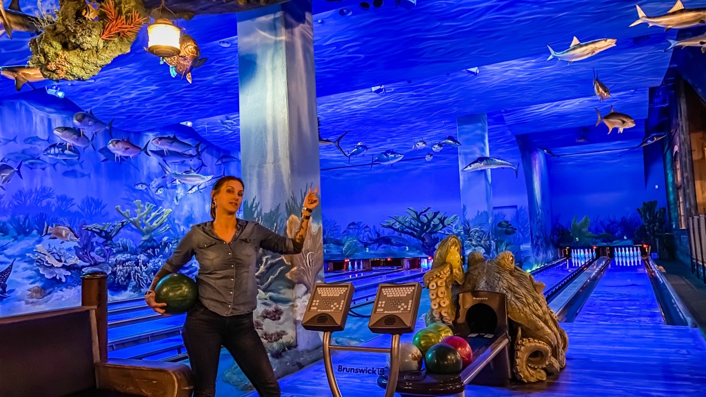 Nous marchons le long des quais et voyons la grosse pyramide « Bass Pro » au loin. Il paraît qu’il faut absolument voir ça. C’est même classé n°1 sur Trip Advisor, et comme l’estomac commence à réclamer, nous décidons d’y aller. Bon … Ce n’est ni plus ni moins qu’un centre commercial dédié à la chasse et à la pêche. Certes, c’est grand et pour les amoureux du genre, c’est la caverne d’Ali Baba, mais je ne vois pas pourquoi les gens nous recommandent cette visite. On y découvre malgré tout un bowling, qui fera office de restaurant pour ce soir.