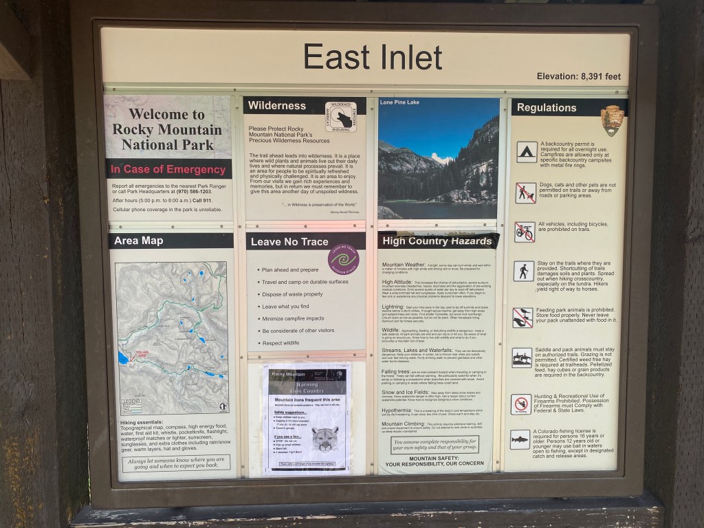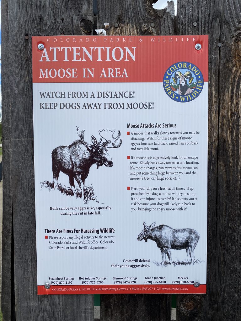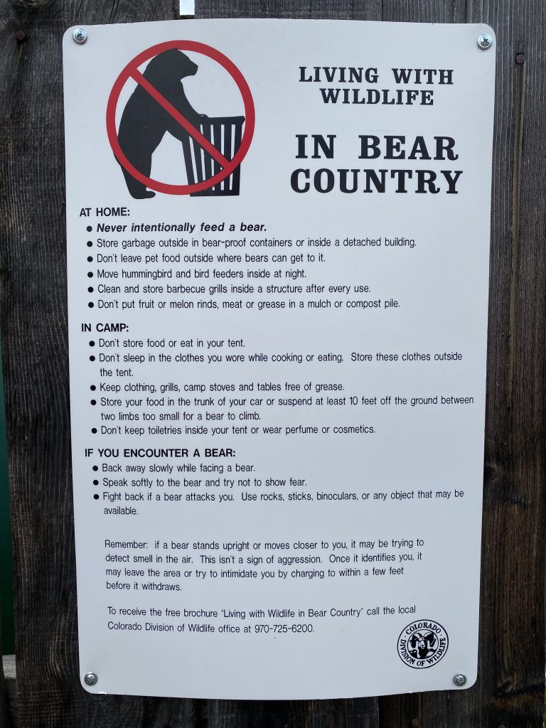 Nous arrivons à Grand Lake Colorado en milieu d’après-midi pour deux nuits. Le camping est plein mais les emplacements sont spacieux, nous ne sommes pas les uns sur les autres. Après une rapide bataille de boules de neige, nous faisons une petite ballade, et tombons sur les panneaux nous mettant en garde, vis à vis de la faune locale : principalement les ours et les élans.