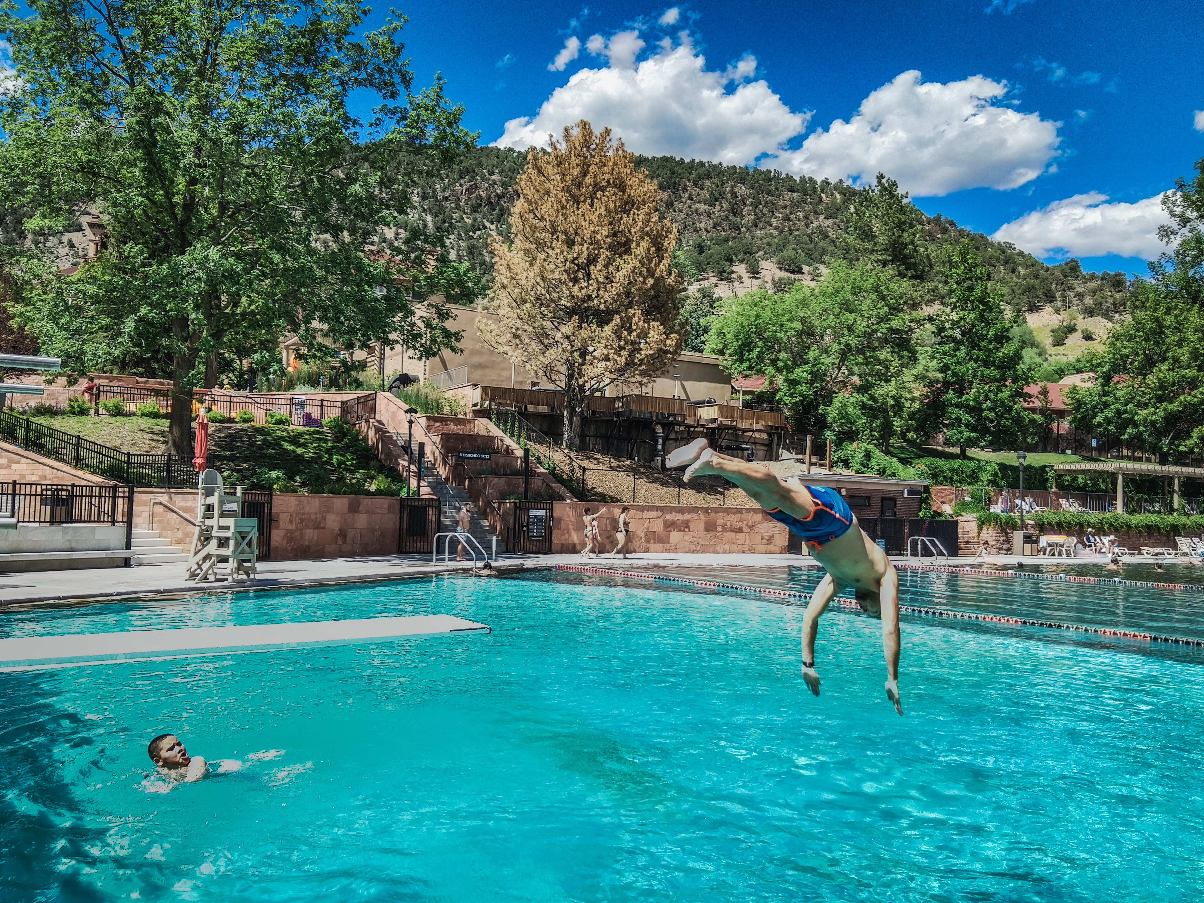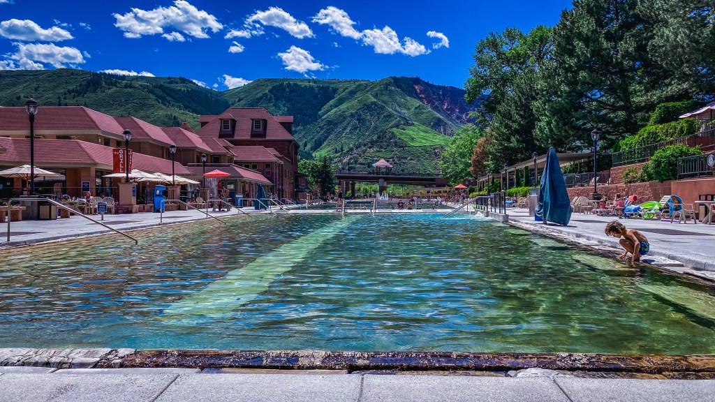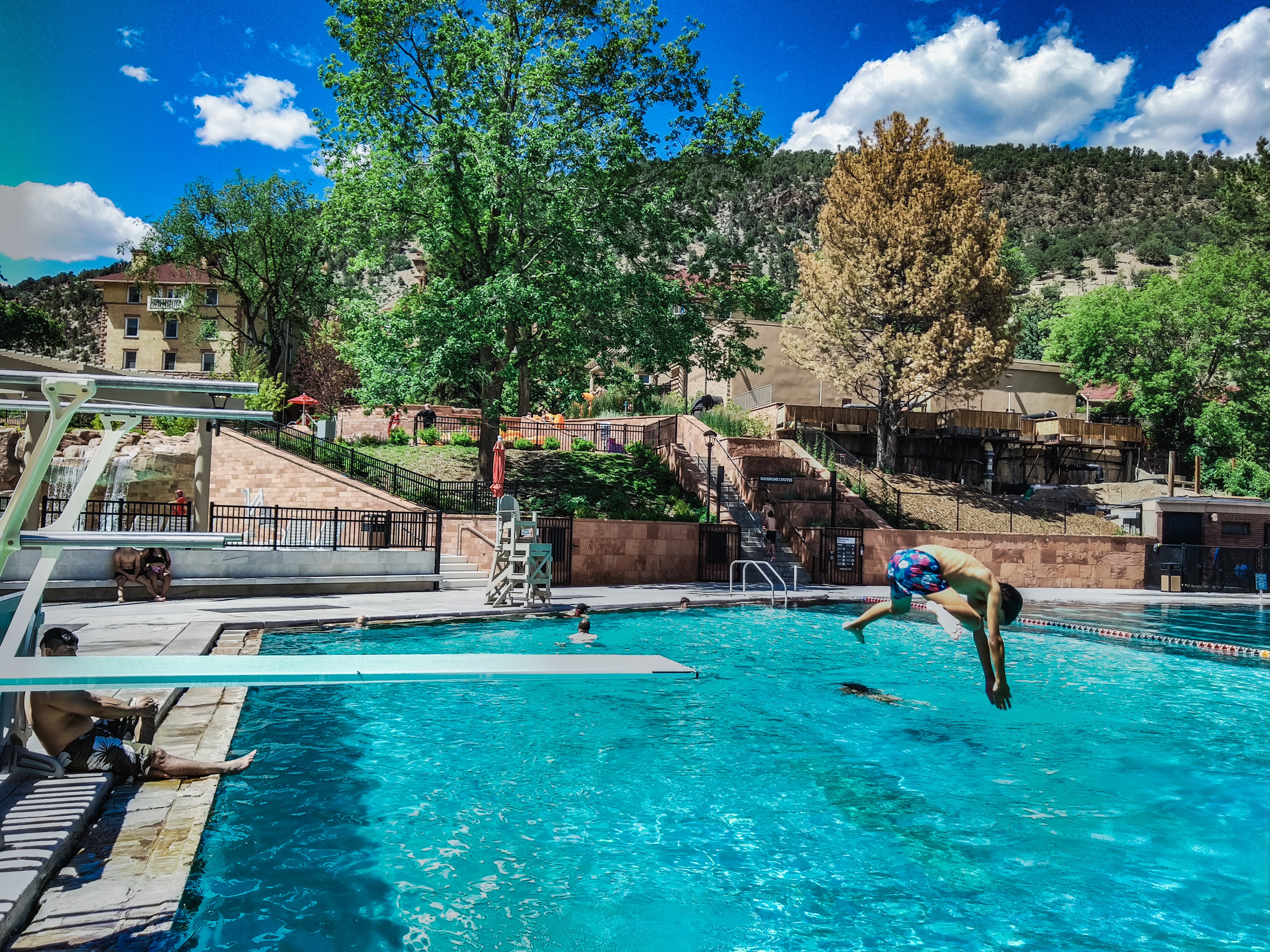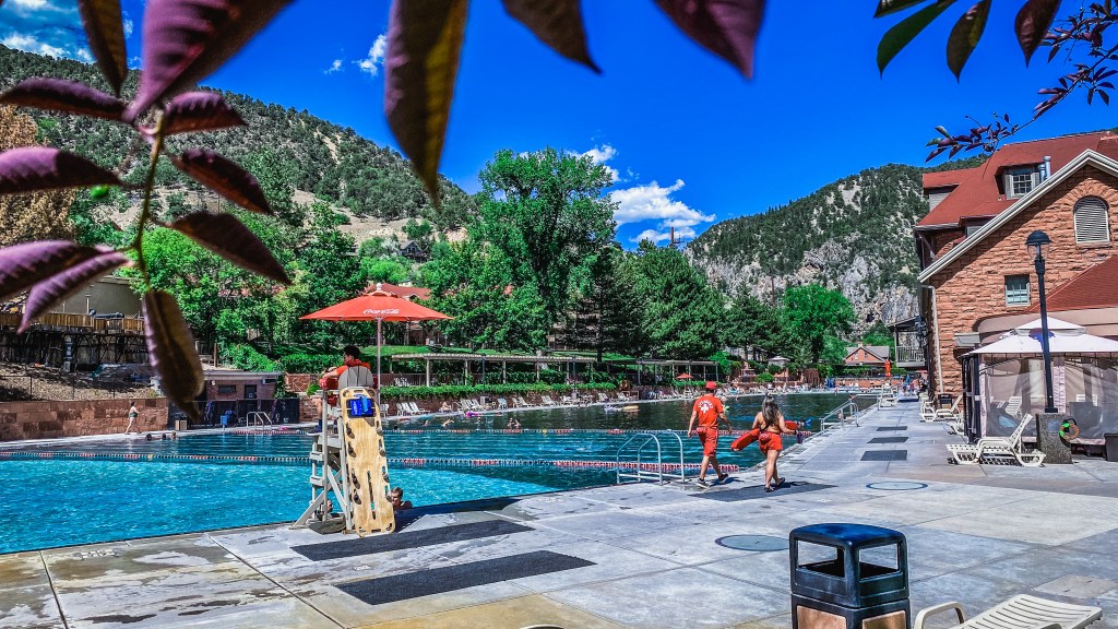 Enfin, nous arrivons à Glenwood Springs. Après avoir pris nos quartiers au camping, nous nous rendons aux thermes d’eau chaude de la ville. J’avais lu qu’il fallait y aller, mais sans avoir approfondi, ni avoir vu de photo. Une fois sur place, nous sommes ébahis par la grandeur du site. Comment dire … En fait, il s’agit du plus grand bassin de sources chaudes minérales au monde ! La source Yampah qui alimente le bassin, produit 3,5 millions de gallons (13 millions de litres) d’eau chaude par jour, à une température de 122°F (50°C). L’eau est refroidie à 40°C pour alimenter un premier bassin. Elle est encore refroidie à 34°C pour alimenter le second -énorme- bassin de 100 mètres de long, contenant plus de 3,7 millions de litres. Des chiffres qui font tourner la tête. Mais une fois dans l’eau, la tête se détend aussitôt !