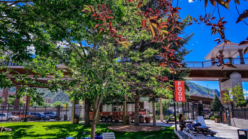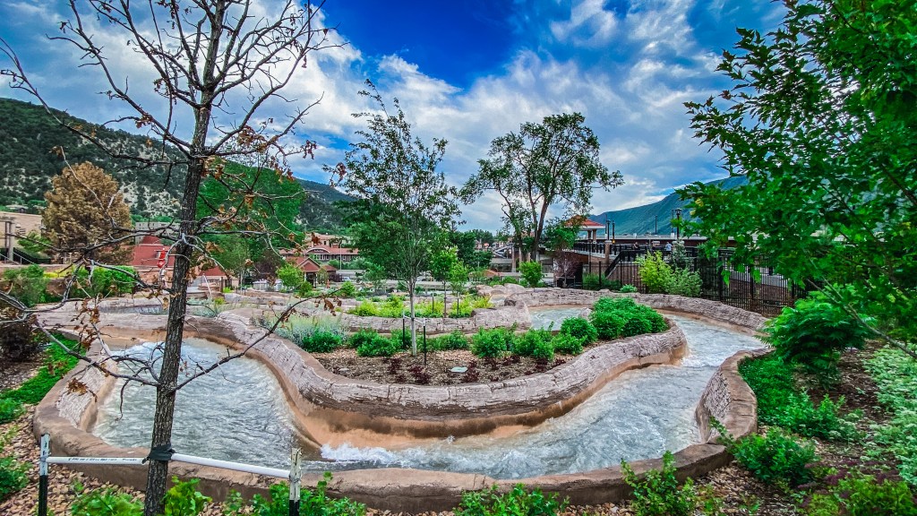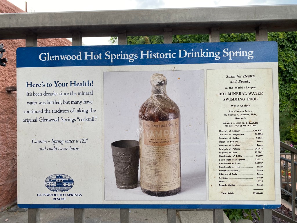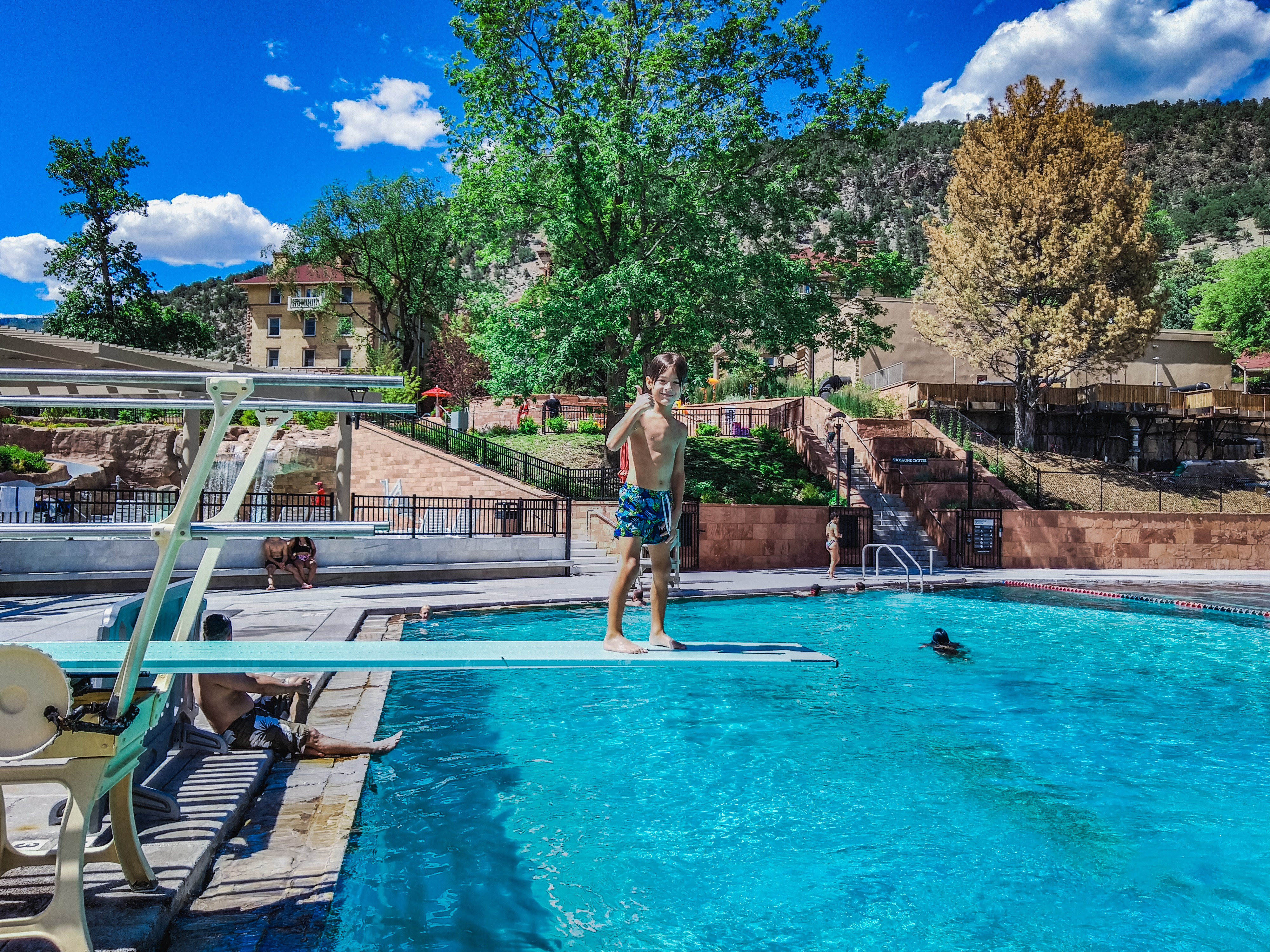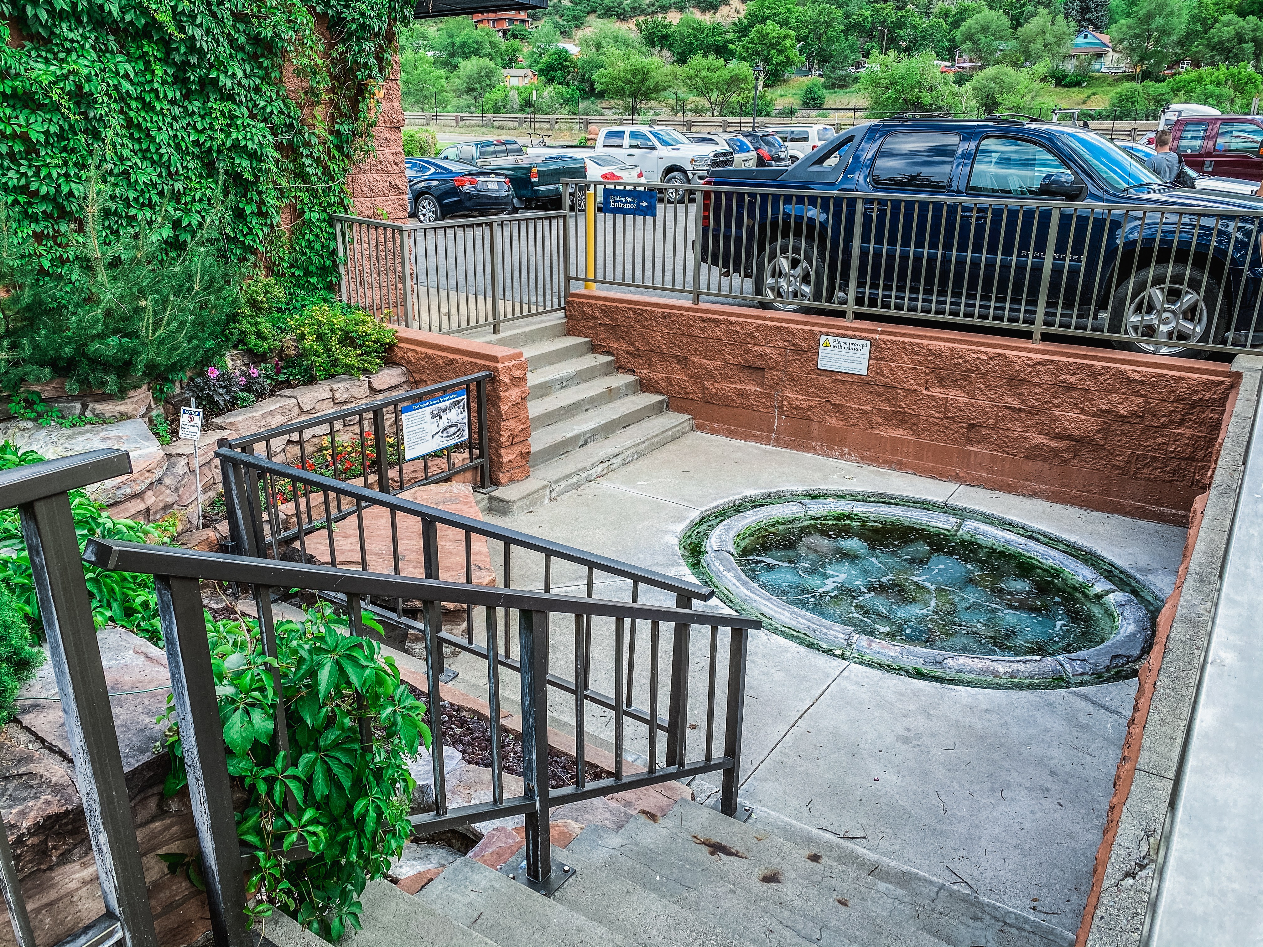Enfin, nous arrivons à Glenwood Springs. Après avoir pris nos quartiers au camping, nous nous rendons aux thermes d’eau chaude de la ville. J’avais lu qu’il fallait y aller, mais sans avoir approfondi, ni avoir vu de photo. Une fois sur place, nous sommes ébahis par la grandeur du site. Comment dire … En fait, il s’agit du plus grand bassin de sources chaudes minérales au monde ! La source Yampah qui alimente le bassin, produit 3,5 millions de gallons (13 millions de litres) d’eau chaude par jour, à une température de 122°F (50°C). L’eau est refroidie à 40°C pour alimenter un premier bassin. Elle est encore refroidie à 34°C pour alimenter le second -énorme- bassin de 100 mètres de long, contenant plus de 3,7 millions de litres. Des chiffres qui font tourner la tête. Mais une fois dans l’eau, la tête se détend aussitôt !