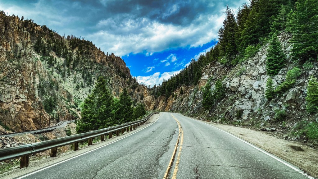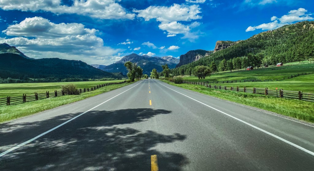 Un bras plus tard, nous prenons enfin la route vers le Parc National Rocky Mountain. La météo est favorable. Les conditions sont réunies pour un trajet sans stress. Oui mais … Passé 60 miles à l’heure, Jay-Cee vibre du train avant. Grrrrrrrr. Bon sang ! Mais on sort tout juste du garage ! Je me demande si le fait d’avoir échangé les roues n’y est pas pour quelque chose. L’usure sur les pneus est différente alors ça peut éventuellement expliquer ces vibrations. Bon. Nous verrons bien. Pour l’heure, il faut vraiment avancer, sinon nous allons encore perdre des réservations …