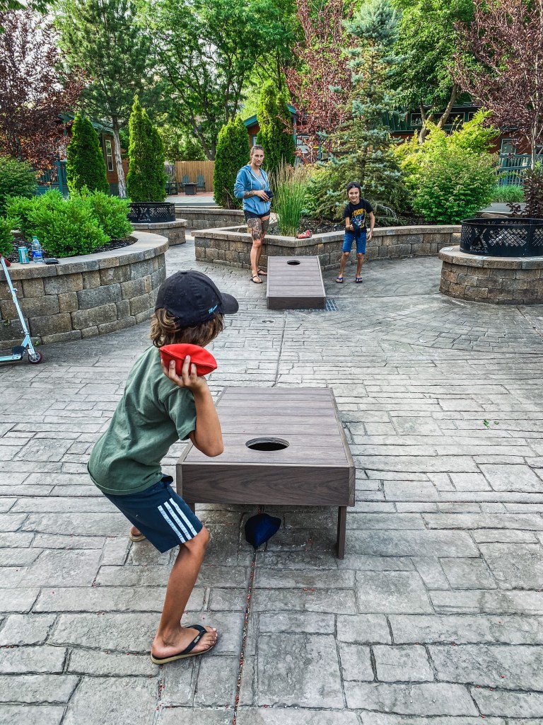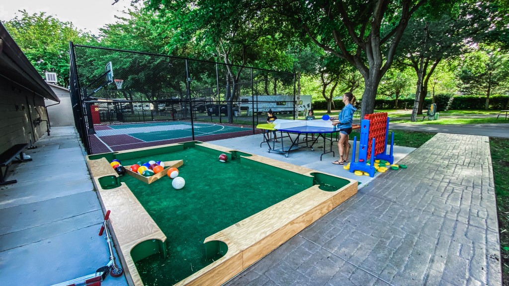 Nous trouvons des activités sympas dans le camping. Une table de ping-pong à 4 appelée Polypong. Un jeu de billard avec des ballons de football. Et le fameux jeu de Corn Hole.