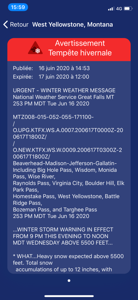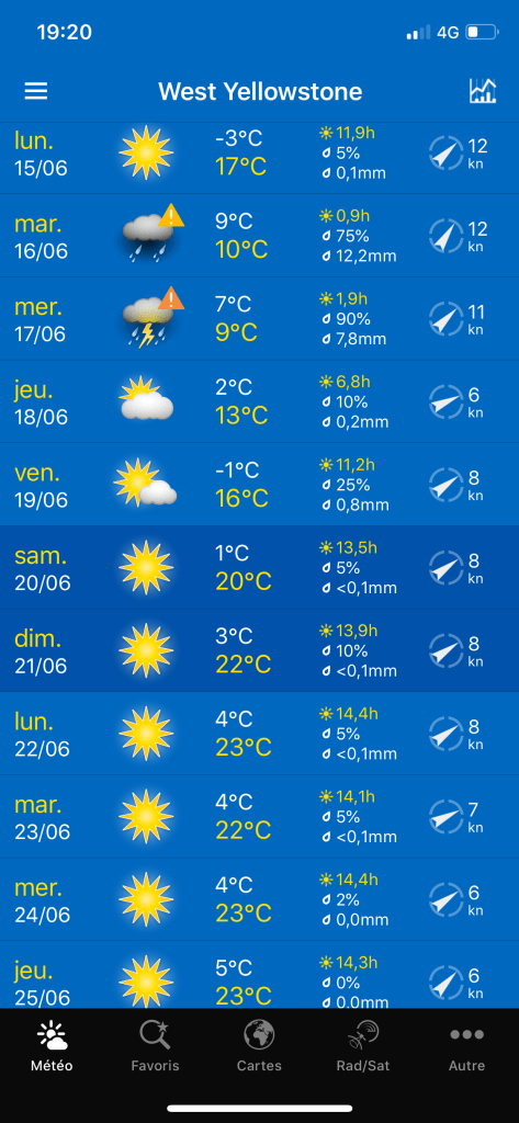 Nous avons trois nuits dans ce camping avant de descendre vers le Parc National de Grand Teton. Nous aurons bien une fenêtre favorable. Et puis si le temps ne veut vraiment pas, nous irons quand même ! Hors de question de quitter la région sans avoir vu les merveilles naturelles de cet endroit mythique …