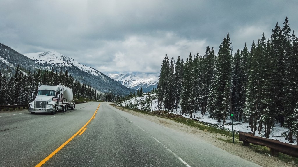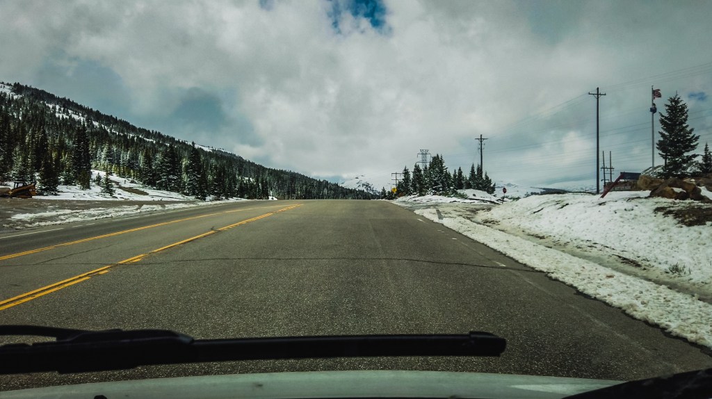 En milieu de matinée, on repart vers le Nord. La route ne fait que monter durant la première heure de route. Pas étonnant, puisque nous franchissons le plus haut sommet de notre périple aux Etats-Unis : « Freemont Pass », à 11 318 ft, soit environ 3 450 mètres d’altitude. La neige est bien présente, tout comme les nuages. Quelques plaques de verglas persistent mais rien de bien méchant. La route est plutôt agréable, et je commence à faire chanter le moteur dans la descente qui nous mène vers Silverthorne. En tous cas, ce n’est pas aujourd’hui que nous ferons chauffer les freins …