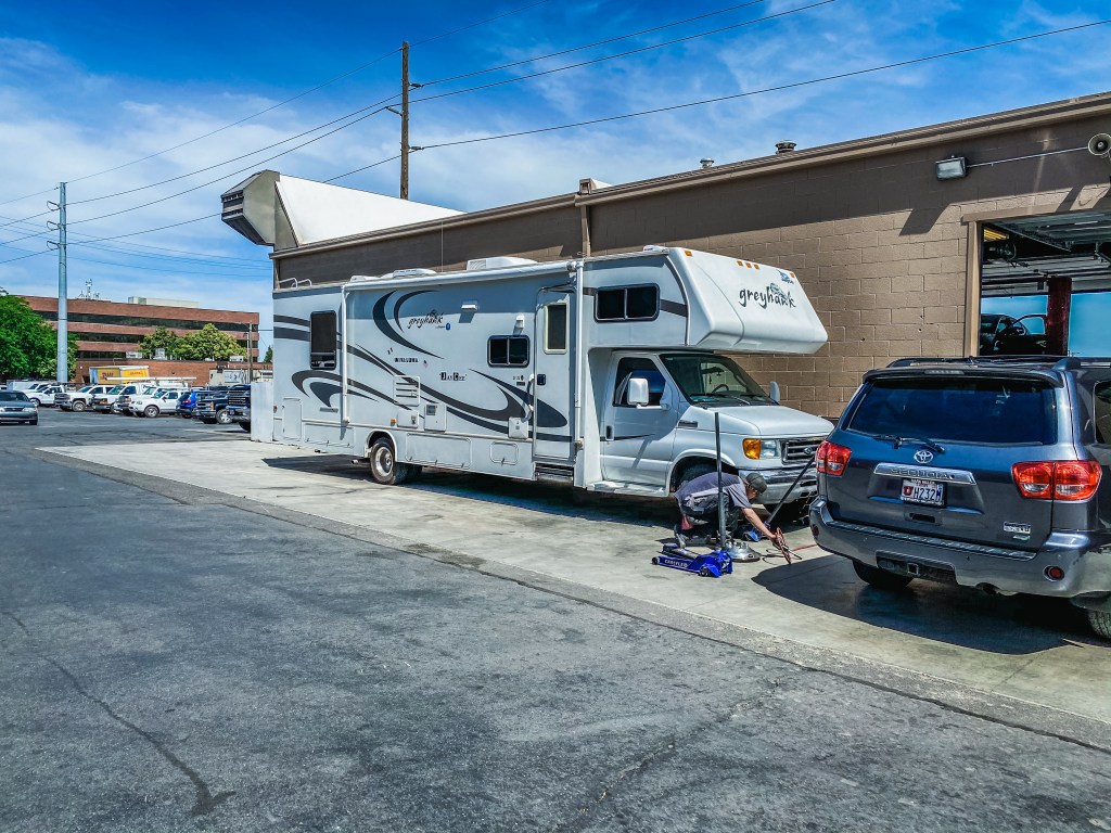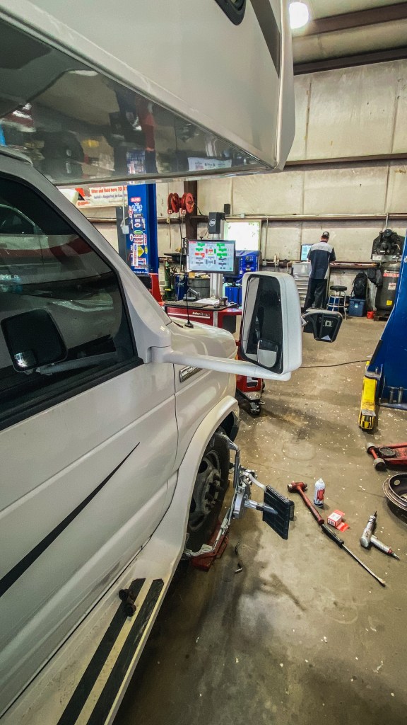 Rendez-vous était pris depuis quinze jours dans un garage du coin, pour faire la vidange. Vu notre récent passage au garage à Durango, j’ai annulé la vidange, mais pas le rendez-vous. On amène Jay-Cee pour un énième contrôle des roues, étant donné que ça vibre toujours.