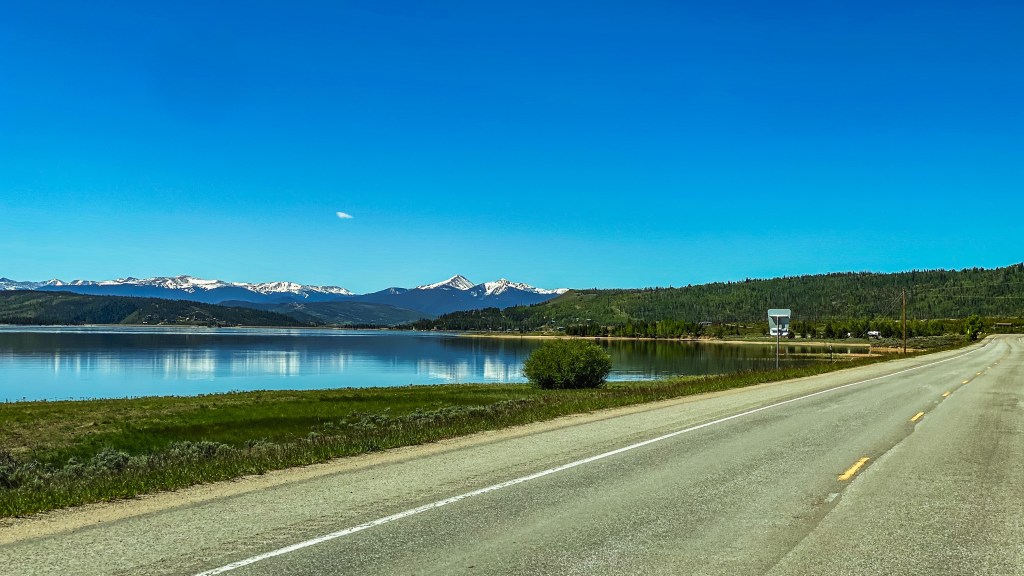 A partir de Silverthorne, la route devient carrément superbe. Les hauts sommets enneigés dominent les vertes prairies bondées d’animaux. Nous alternons entre lacs, collines, et petits canyons encadrant une vieille voie ferrée.